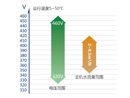 水側(cè)換熱器進水范圍:5~50℃,主機水流量范圍:2~9.5m3/h,滿足全國大部分地區(qū)的地理環(huán)境使用要求;電壓范圍提升至320V-460V,遠(yuǎn)超342V-420V的國家標(biāo)準(zhǔn),輕松應(yīng)對電壓不穩(wěn)問題。