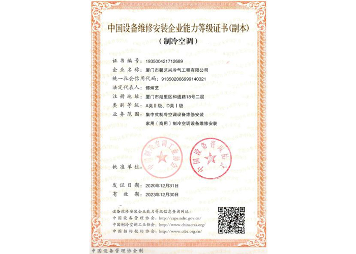 設(shè)備維修安裝證書