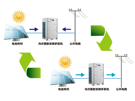 光伏發(fā)電系統(tǒng)不發(fā)電,主機向電網取電運行,機組相當于常規(guī)直流變頻多聯機。 |