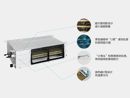 廚享內(nèi)機采用金色防腐翅片換熱器,抗腐蝕能力強,翅片采用寬間距設(shè)計,可減少油煙附著:換熱器采用V型設(shè)計,使風速更均勻。 |